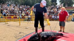 Septiembre es el mes del Atún en Isla Cristina. El ronqueo o despiece tradicional de un atún de unos 100 kilos de la especie rabil o de aleta amarilla, donado por Ficolumé, dio ayer inicio…