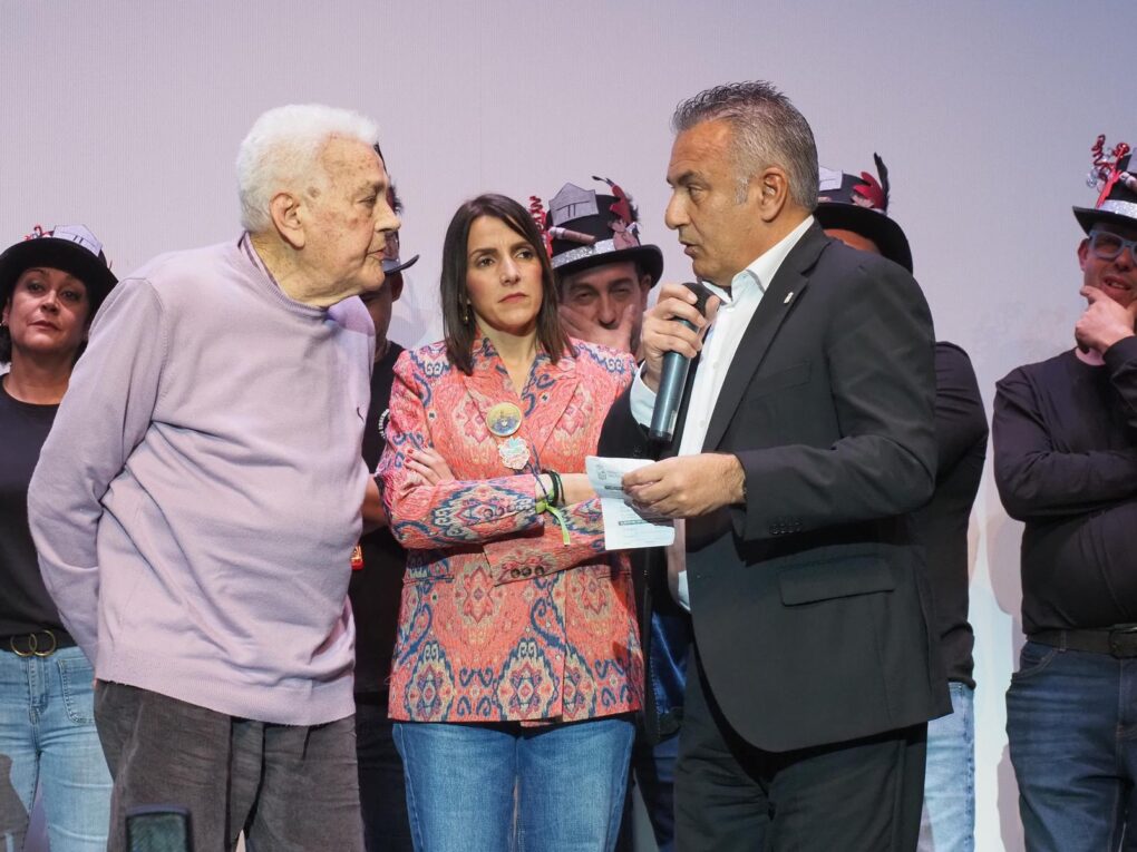 La segunda parte de la velada estuvo dedicada íntegramente a la gala del Pito de Caña, conducida por Miguel Gómez Martínez, “Miguelín”, quien guio un emotivo recorrido por la trayectoria personal y carnavalera de Eugenio Sosa Lagarejo. En este bloque participaron, además de sus hijos, varias agrupaciones y grupos de carnaval que interpretaron cuplés y pasodobles de las comparsas en las que Eugenio ha participado y que ha sacado a lo largo de su extensa trayectoria, piezas que el homenajeado escuchó visiblemente emocionado y profundamente agradecido.