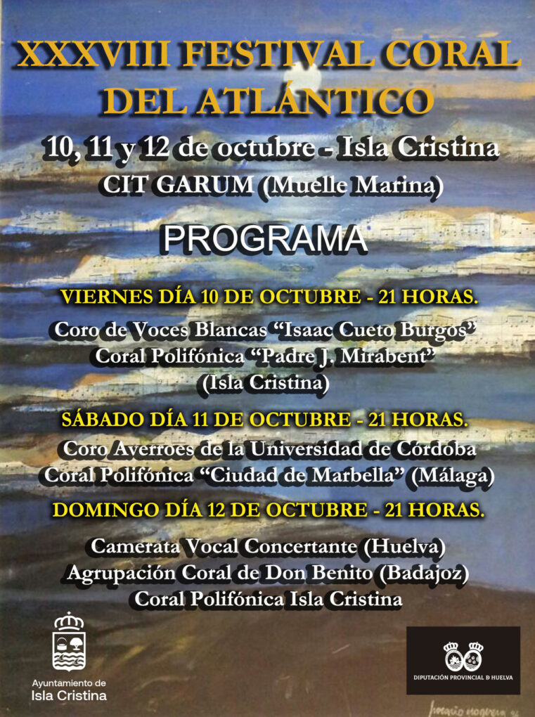 Y concluyó con una invitación abierta “a toda Isla Cristina y a quienes nos visitan a disfrutar del arte, del canto y del espíritu que hace único a este festival. Nos vemos los días 10, 11 y 12 en el CIT Garum. Y que viva el Festival Coral del Atlántico”.